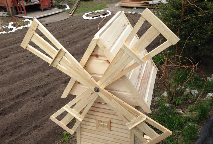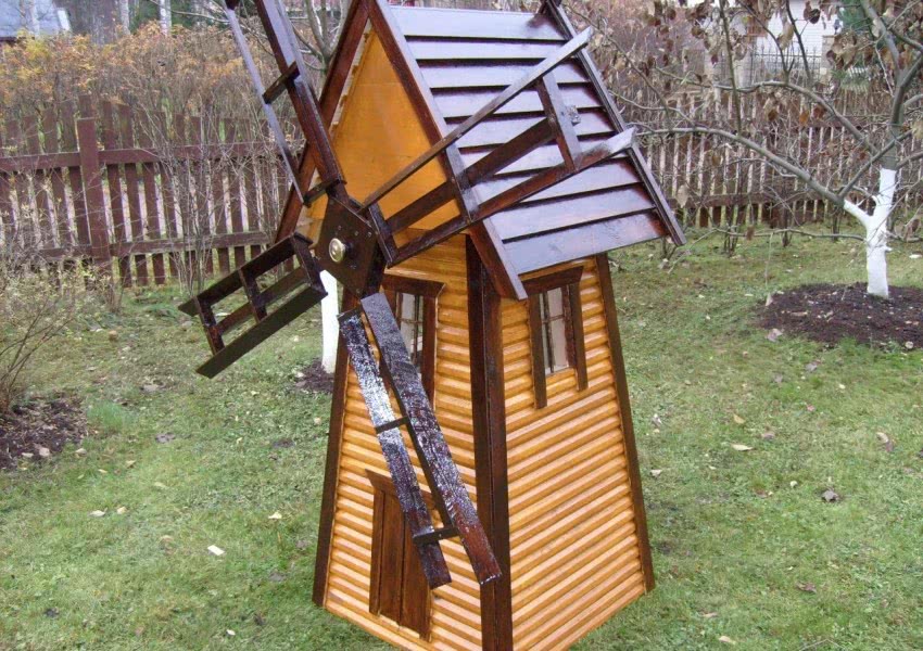 Важно! Выбирая размеры и размах крыльев мельницы, стоит помнить, что такие конструкции даже в декоративном исполнении могут сильно шуметь на ветру. Для сада это не очень хорошо