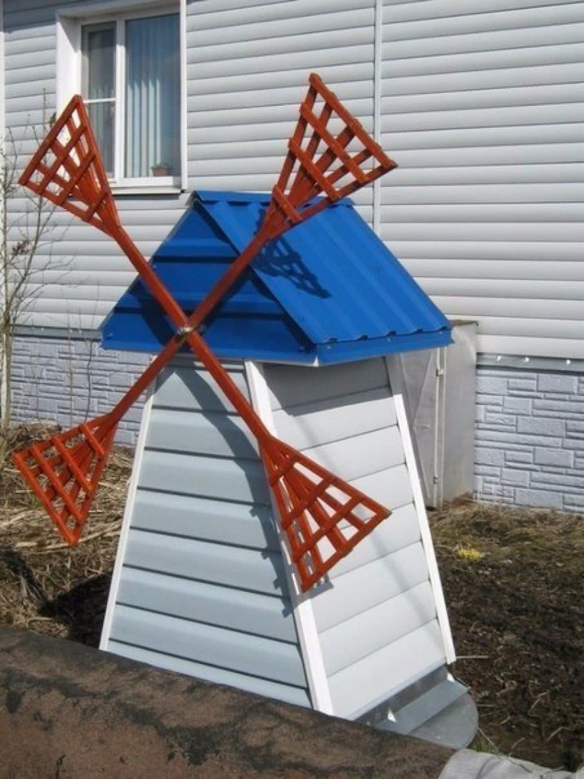Естественно, что главная функция декоративной мельницы — это украшение для сада. Однако с помощью нее вы можете скрыть мелкие элементы инженерных коммуникаций, облагородив участок. Люк септика, вентиляционная труба, поливочный кран станут незаметными для ваших гостей, а сад получит стильный декоративный объект. Такие мельницы, как правило, не требуют больших затрат, выполняются в маленьких размерах и легко вписываются в любой ландшафт.