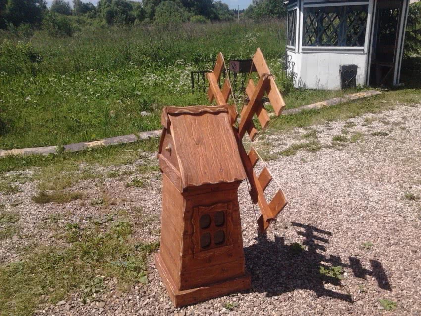 Так же можно поставить поделку возле беседки, но в этом случае конструкции должны сочетаться между собой стилистически. К примеру, беседка может быть обшита такой же вагонкой, как и мельница.