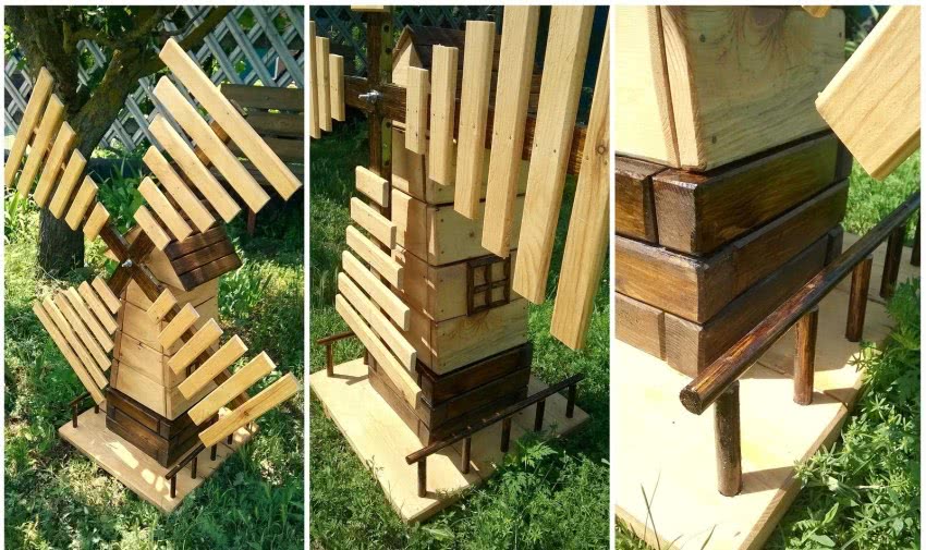 Последний этап — изготовление и установка лопастей. Лопасти можно сделать из деревянных реечек-раскладок. Причем, их внешний вид может быть абсолютно произвольным — все зависит от фантазии и умения мастера. Крепить раскладки между собой можно с помощью мелких гвоздиков — этого вполне достаточно. В месте пересечения лопастей сверлим отверстие под ось и устанавливаем лопасти на ось, фиксируя конструкцию с двух сторон парами гаек (гайка+контрогайка). Осталось покрыть поделку лаком и декоративная мельница, выполненная своими руками готова! Можно устанавливать на приусадебном участке и любоваться.