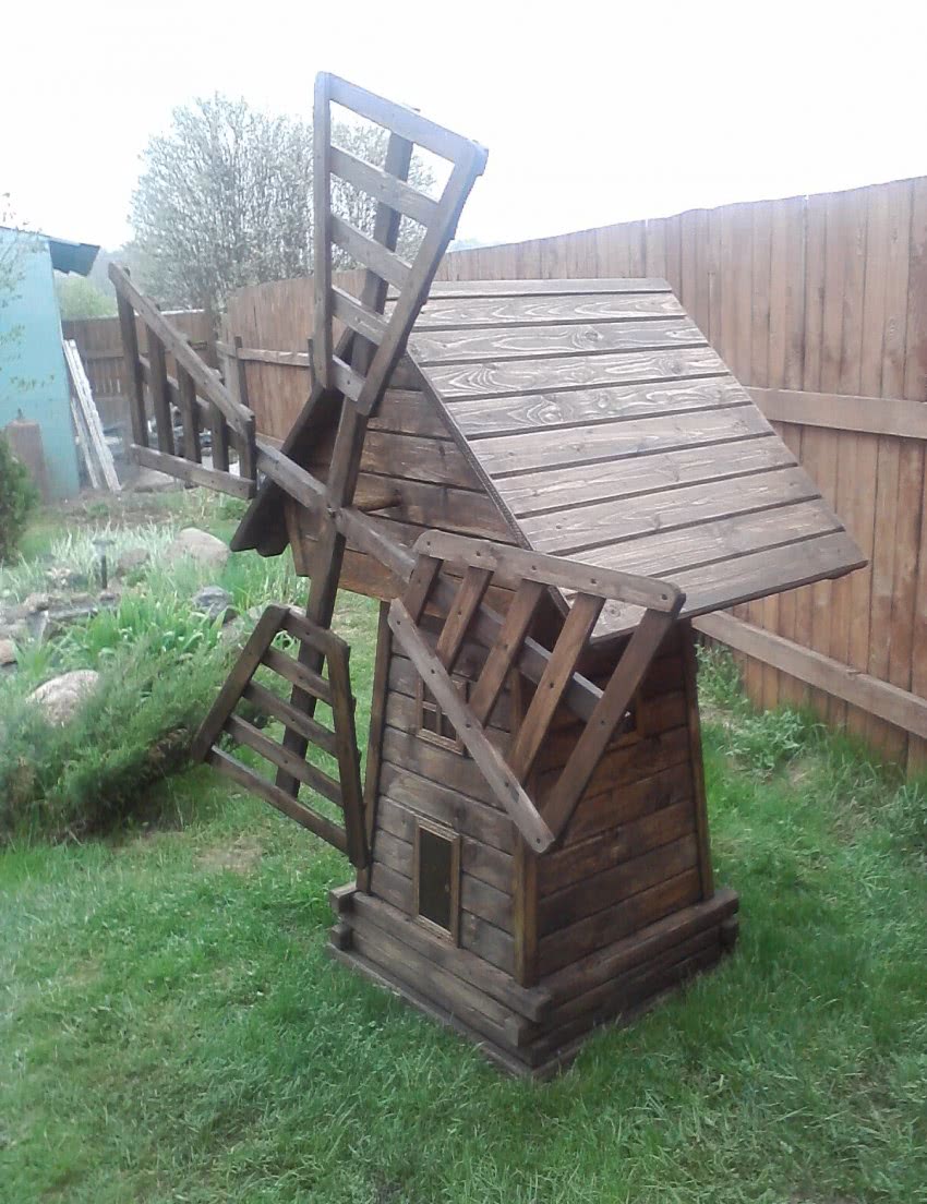 Некоторые сооружения деревянной декоративной мельницы расширяют свое предназначения и с легкой руки хозяина превращаются в детский домик. В масштабных идеях мельница может стать частью игровой площадки, или сараем для хранения инструментов. У креативных хозяев мельница декоративная для сада становится стилизованной туалетной комнатой, а люди с инженерными навыками создают действующие модели мельниц.