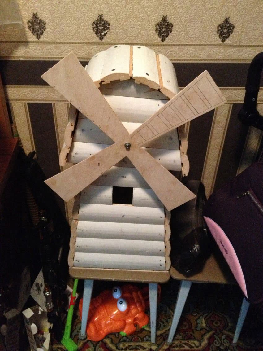 Кроме самого ветряка, нужно продумать систему его крепления к мельнице, ведь мы хотим, чтобы лопасти у нее вращались, как настоящие