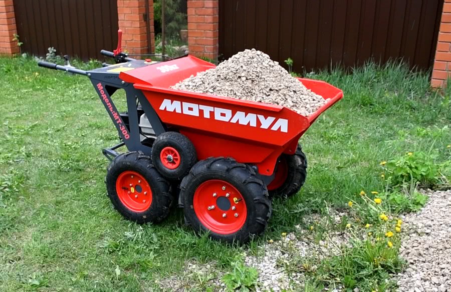 Для четырёхколёсных самоходных тачек важно наличие функции опрокидывания корыта. Такая техника обладает максимальной грузоподъёмностью.