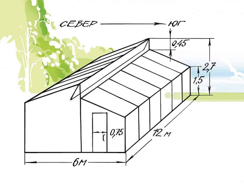Перепад между скатами крыши по задумке Митлайдера должен быть 45 сантиметров. Высота южной стенки —1,5 метра. Дверь навешивают с одного из торцов парника. Ширина дверного полотна — 75 сантиметров. Идеальные размеры часто нарушают.