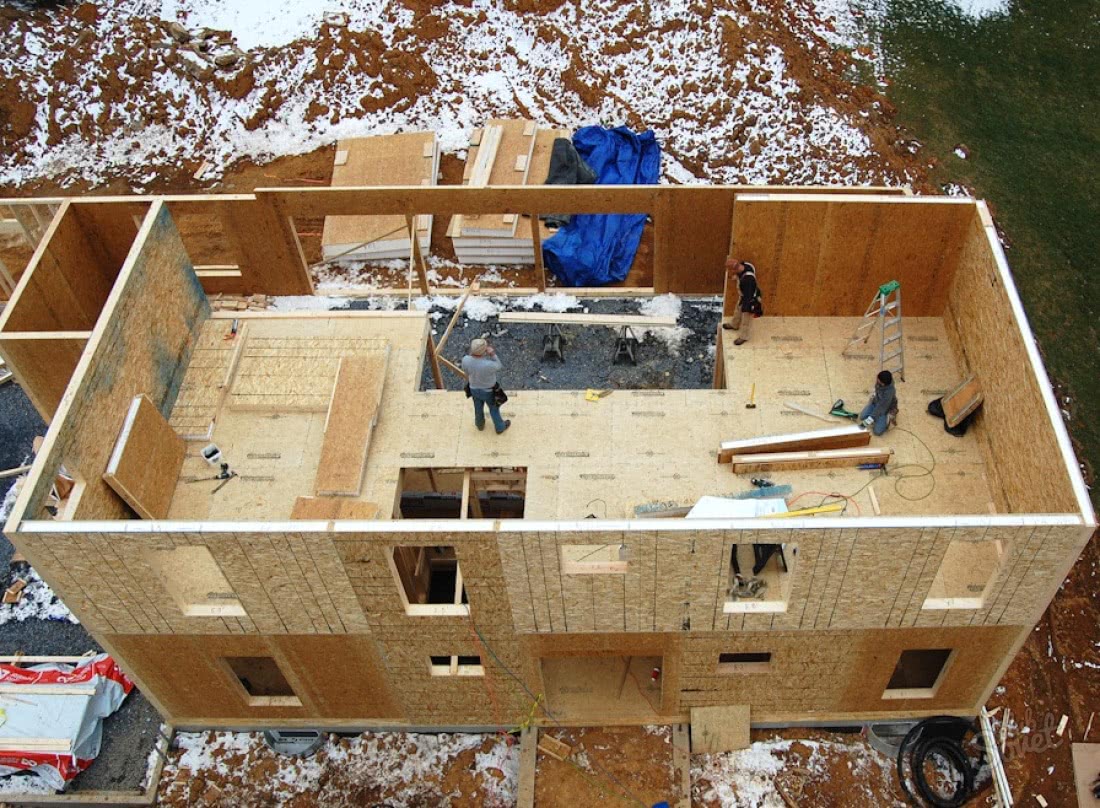 - Дерево для каркаса дома. Если дерево не высушено, его как можно скорее надо монтировать и после сборки каркаса безотлагательно зашивать ОСБ. Значит, плиты ОСБ тоже должны быть подготовлены заранее.