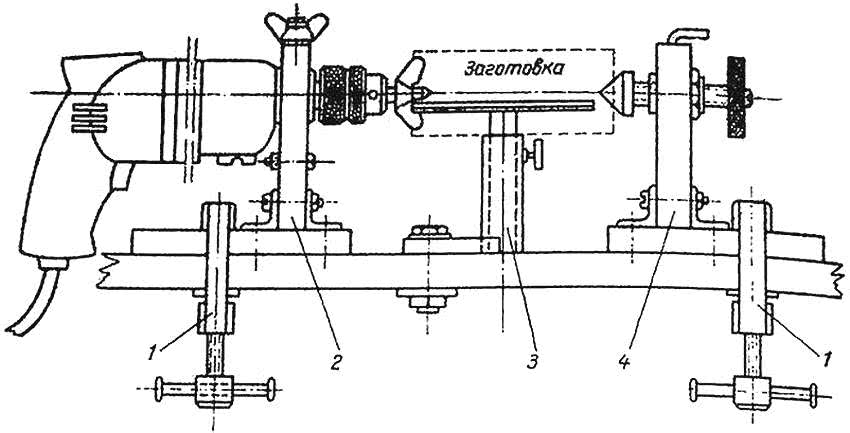 Схема устройства самодельного токарного станка на основе дрели: 1 — крепления к столу или верстаку; 2 — передняя опора; 3 — опора под заготовку; 4 — задняя опора