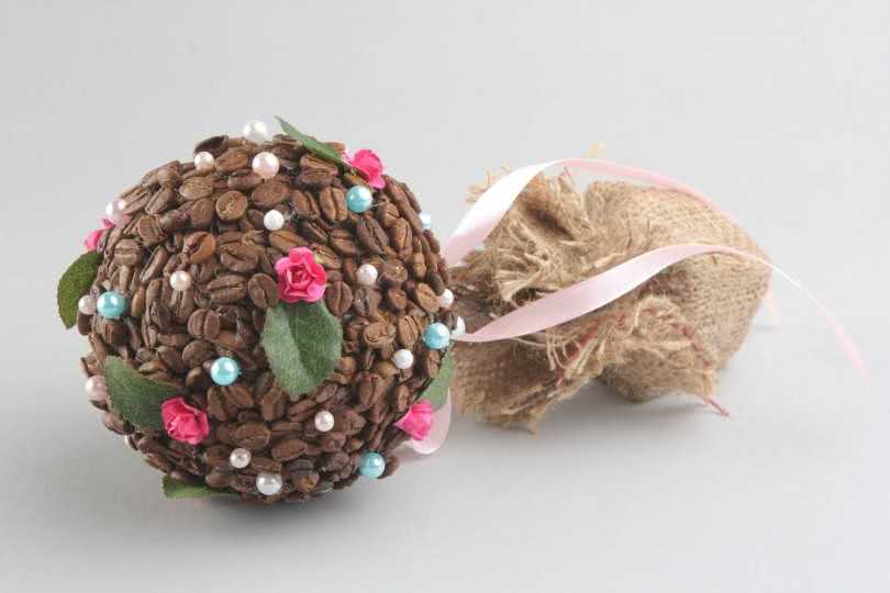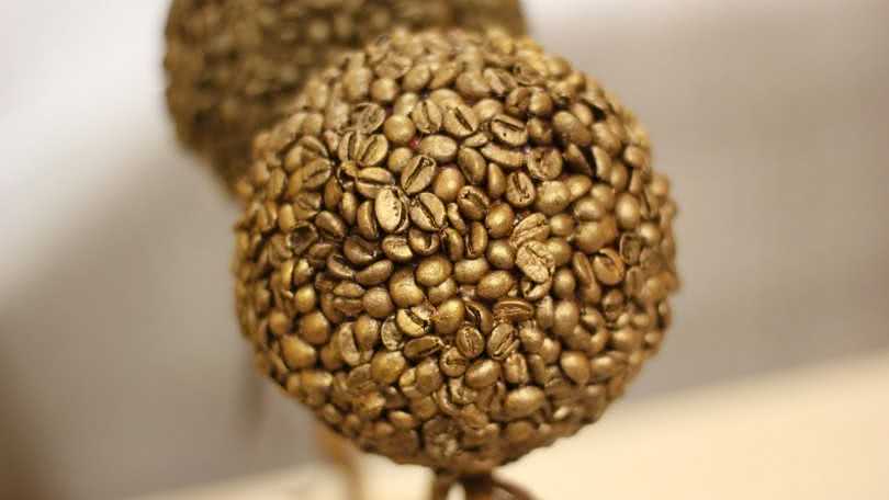 На первом этапе используется основа (можно взять маленький детский мячик из любого материала или пенопластовую заготовку) и кофе. Обклейте полностью весь шар зернами плоской стороной вниз. Оставьте свободным лишь небольшой участок, к которому вы будете приклеивать ствол.