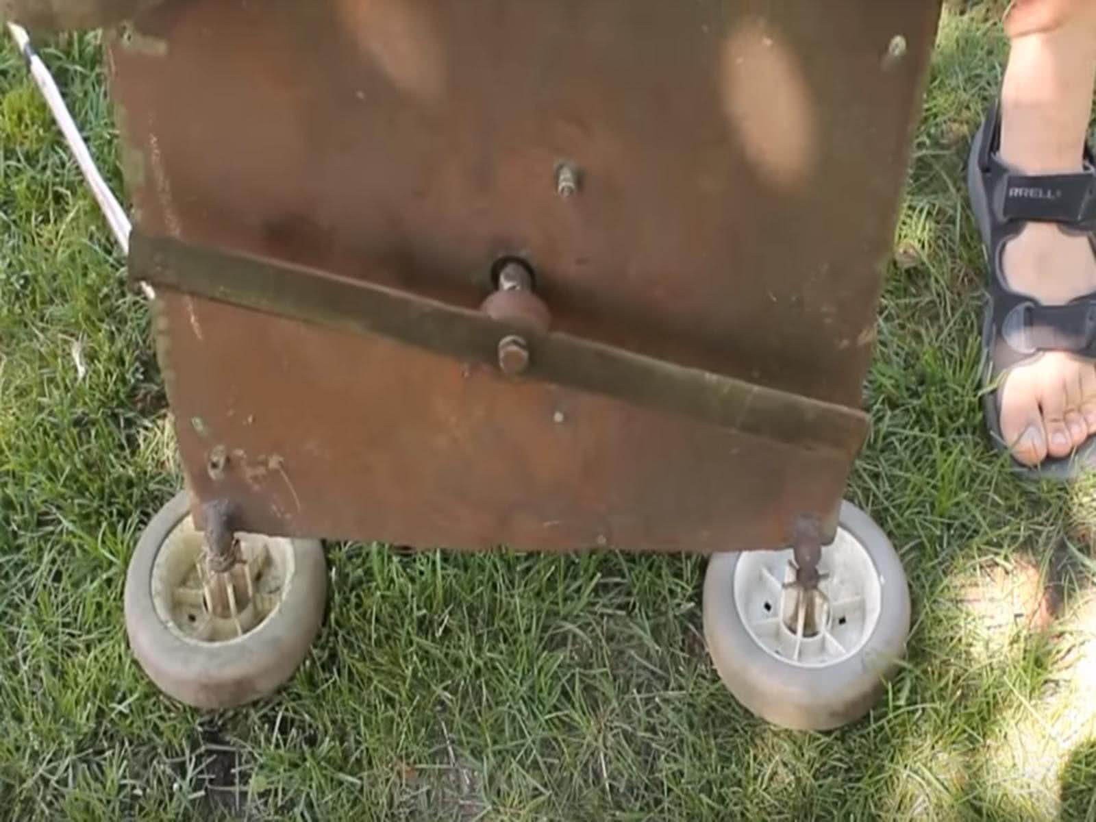 Такую форму умельцы советуют из соображений безопасности — нож из полоски стали может сломаться не поранить при попадании на камень как еще его называют палку, а цельному металлическому диску почти ничего не грозит. Ручка для газонокосилки а возможно любой. Распространена практика использования шасси от старых колясок — это решает сразу три проблемы — не колеса, не каркас, не ручку. В отсутствие рядом старой коляски ручку есть вариант наварить из металлической трубы как еще его называют даже сделать из черенка от лопаты.