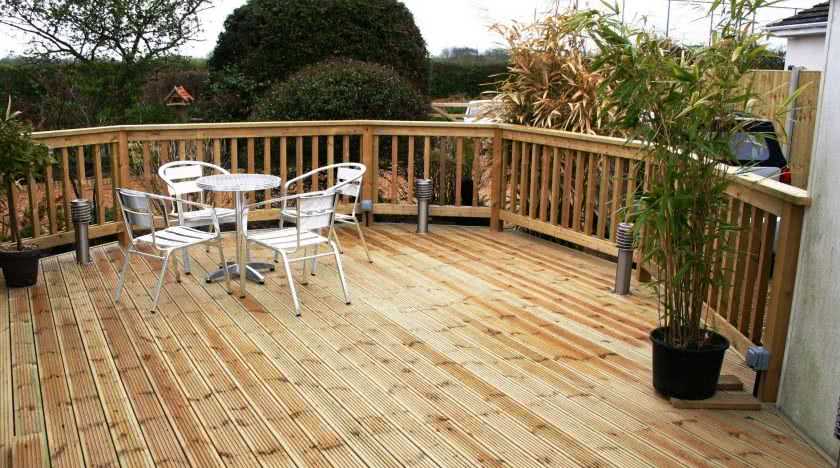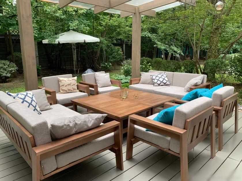 Для этой поделки из деревянных поддонов дополнительно понадобится брус, чтобы создать полноценную террасу. Этот способ можно смело называть бюджетным, так как поддоны после строительства остаются бесплатно, их, как правило, не забирают и не выбрасывают. Единственные траты будут заключаться в покупке бруса и расходных материалов, таких как лак и краска (при необходимости).