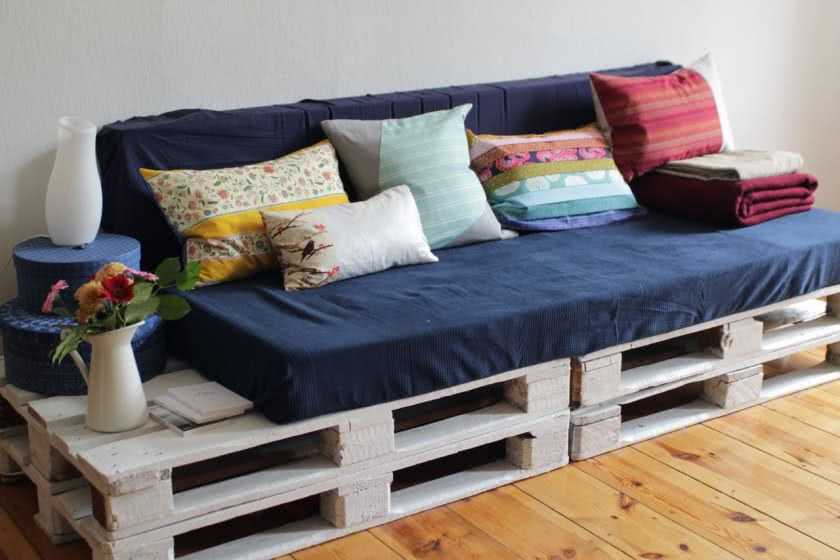 После того, как конструкция будет скреплена при помощи гвоздей, необходимо снова зачистить проблемные участки, далее покрыть краской и лаком. Фактически, на этом этапе заканчивается построение дивана. Основа ставится возле стены, чтобы было удобно располагать подушки, при этом не имея спинку у дивана. На основу выкладывается матрас, подушки.