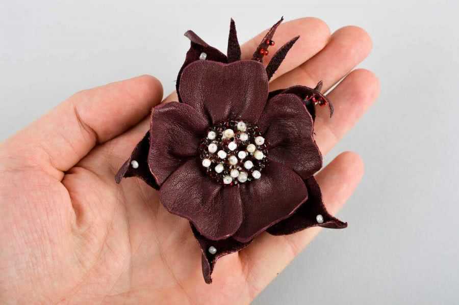 На картонном листе рисуем шаблон в виде трех цветков, разных по размеру. Переносим выкройку на кожу и аккуратно вырезаем. Склеиваем цветы в порядке убывания. В центр цветка крепим бусину.