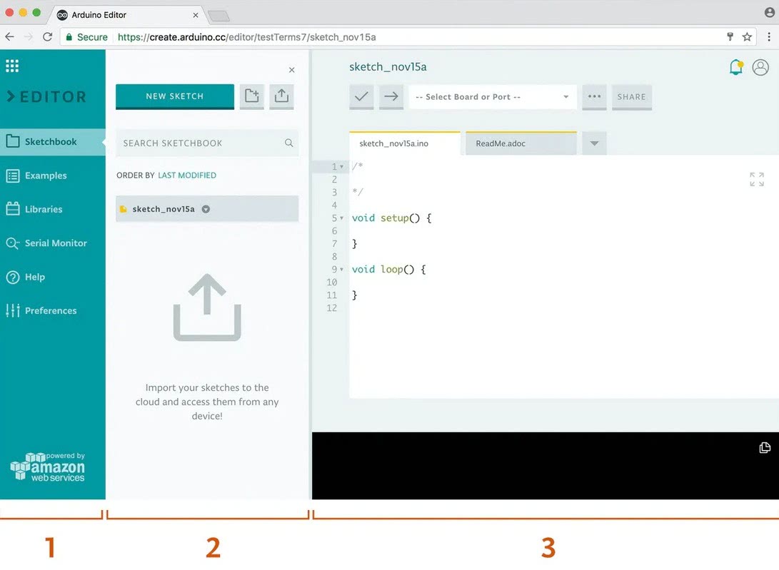 После запуска Arduino Web Editor вы увидите в нем три основных столбца.