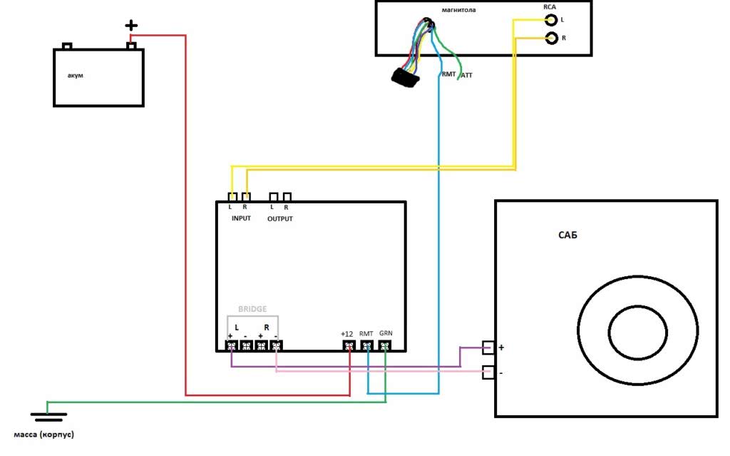 Когда двигатель работает на холостом ходу, по схеме автомобильного усилителя для сабвуфера ему положено потреблять 1,5 ампера. Чтобы аккумулятор не разрядился, устанавливают реле с отдельной клеммой REM и напряжением в 12 вольт, а также током выше 20 ампер. Этот REM подключается к выходу магнитолы + 12 вольт. Сабвуфер будет включаться вместе с головным устройством.