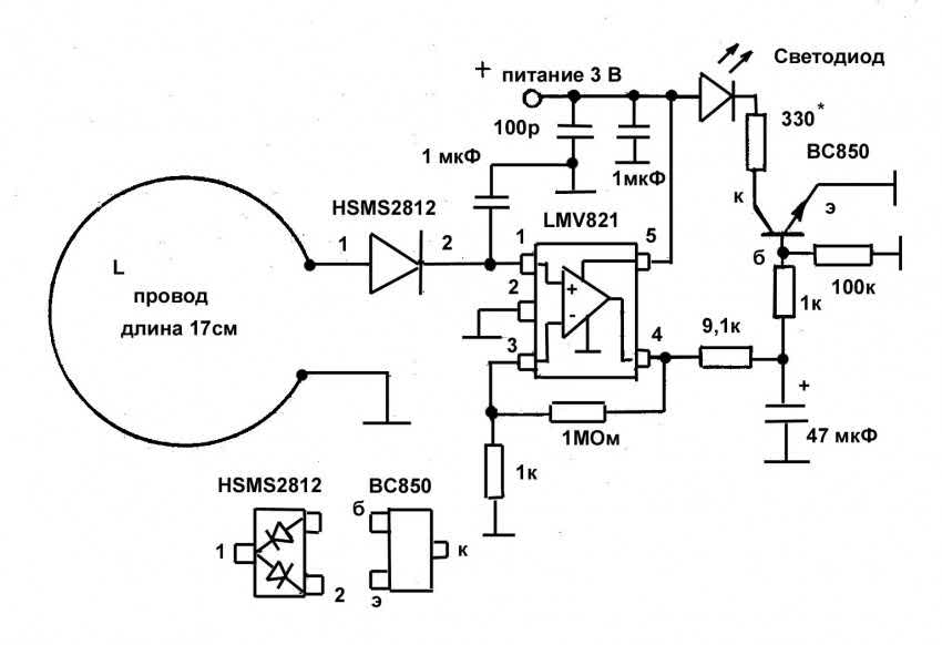 Схема усилителя показана на рис. 1. Он выполнен на малошумящем биполярном транзисторе. Коэффициент усиления составляет около 20 дБ.