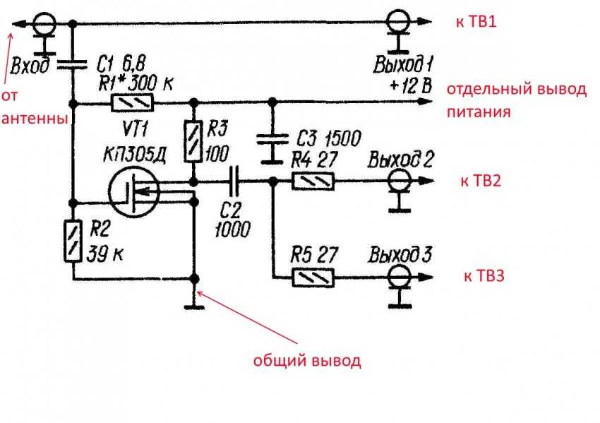 На схемах антенных усилителей своими руками указано, каким образом должно осуществляться подключение аппарата к телевизору. Телевизионный кабель идёт к усиливающему сигнал устройству, а затем сигнал попадает в телевизор. Эта схема универсальна.