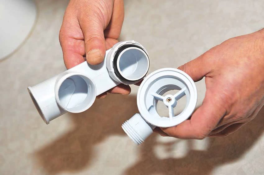 На патрубок подключения затвора к сточной трубе следует надеть гайку и резиновый уплотнитель. Собранный узел вставляется в отвод на корпусе с последующим затягиванием гайки. Чтобы не повредить резиновое уплотнение, его рекомендуется смазать мыльной водой или техническим маслом.