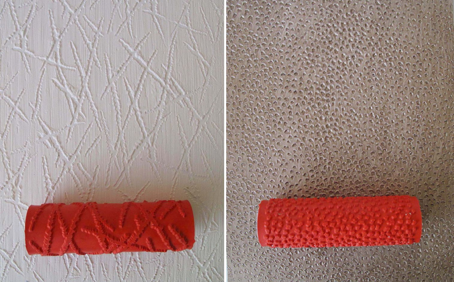 - В первом случае валиком выполняют штамповку различных причудливых фантазийных и простых узоров и рисунков: соединяют их друг с другом, как при наклейке полотен обоев. Вдавливается инструмент с разной силой для получения более или менее выраженного фактурного рельефа. Используется при этом способе валик с жёсткой или мягкой резиной, который прокатывают по сырой оштукатуренной поверхности стены. После этого она приобретает красивую рельефность с разной текстурой. Такие инструменты с различным рисунком или просто шероховатым цилиндром дают возможность имитировать разные материалы: мех и древесину, текстиль и каменную крошку, а также волокна бамбука.