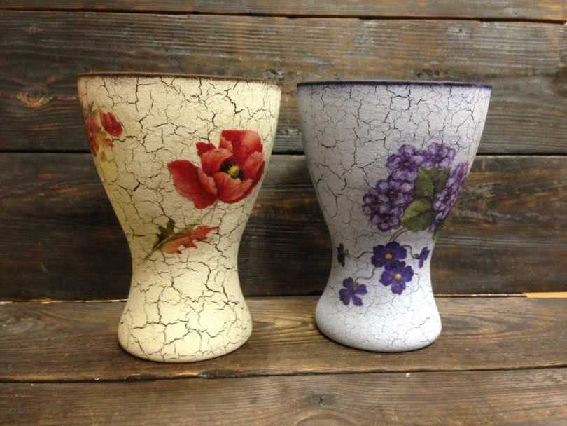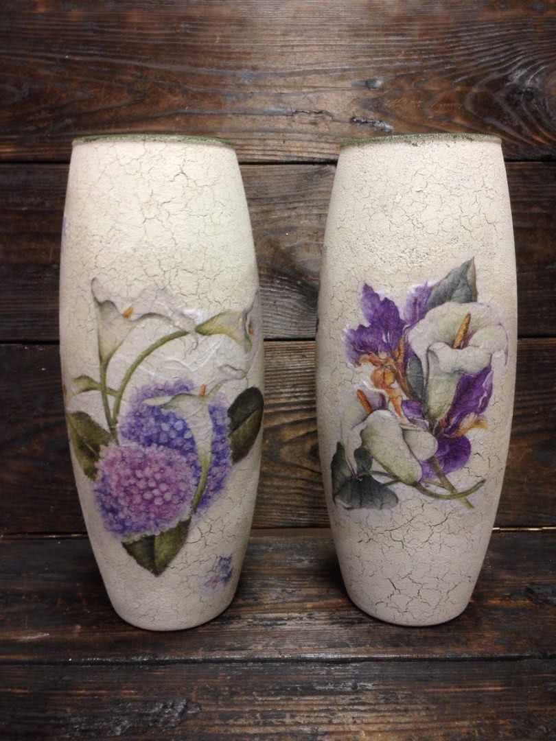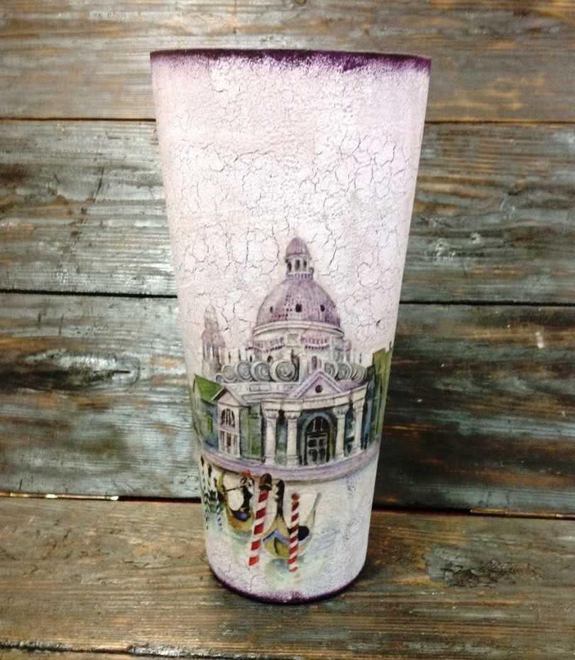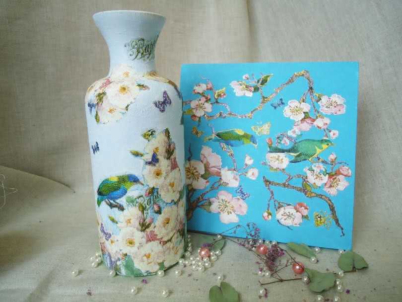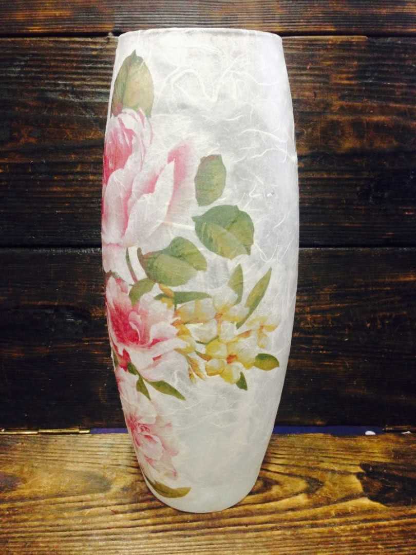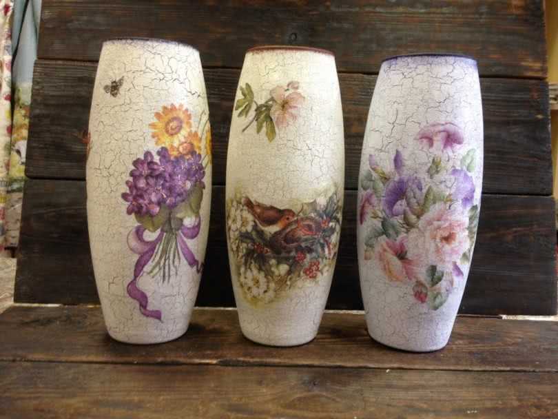 Можно декорировать сосуд с помощью салфеток. Рисунок для декупажа может быть любым, от цветочных мотивов, до винтажных изображений. Материалы для творчества: