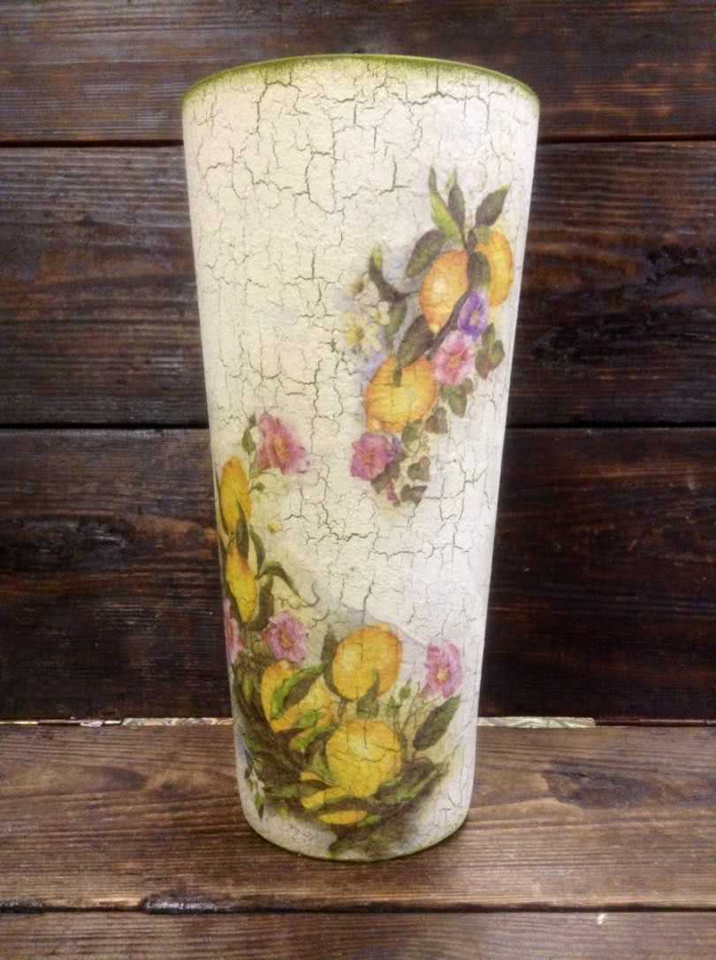Существуют декупажные салфетки на самые разные тематики, поэтому можно создать вазу в любом стиле. Например, как это кухонное украшение, которое может служить не только для цветов, но и для свежей огородной зелени.