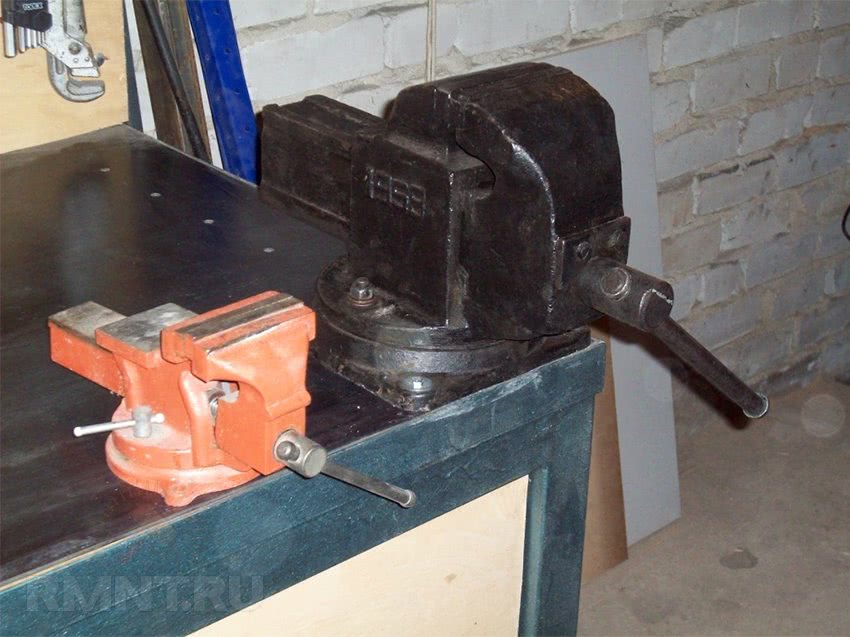 В качестве заключения дадим пару подсказок: чем и как укомплектовать верстак для удобной работы. Первое и самое очевидное — слесарные тиски. Они должны быть достаточно массивные, для гаража рекомендуется раствор губок не менее 15 см