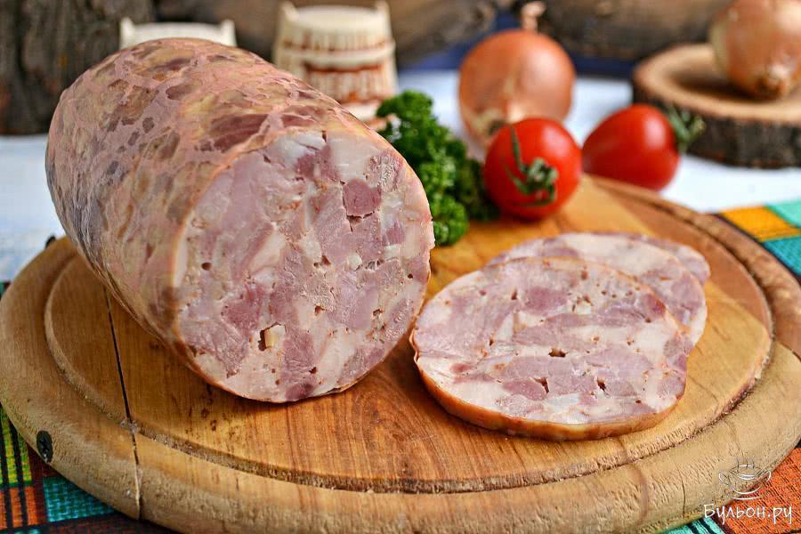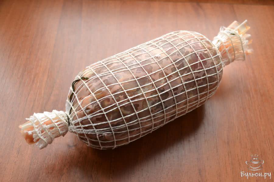 - В качестве оболочки используют свиные кишки или подручные средства: фольгу, пластиковую бутылку, пленку пищевую или ветчинницу.