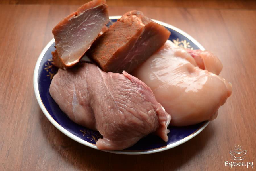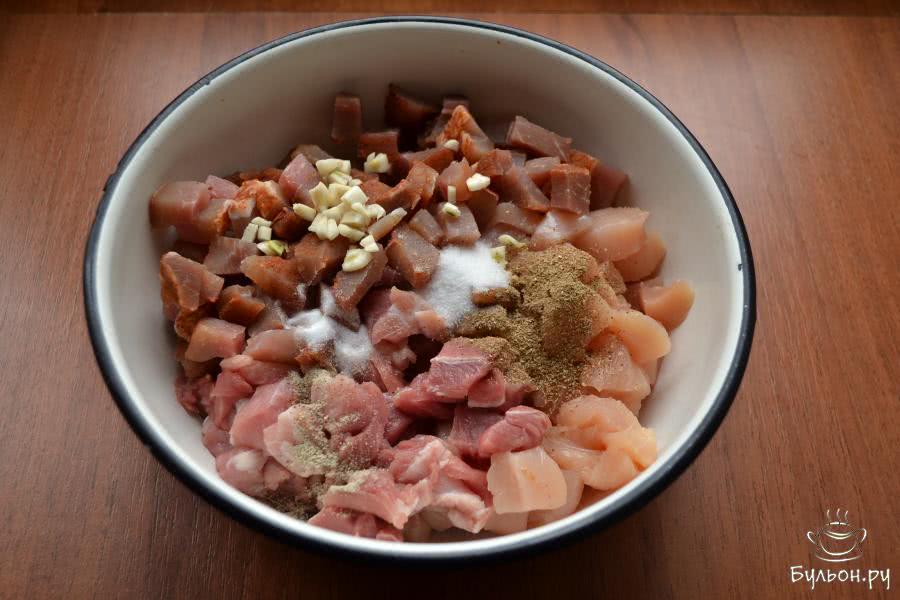 Шаг 1. Куриное и свиное мясо помыть под проточной водой и обсушить бумажными салфетками. Чеснок почистить от шелухи.