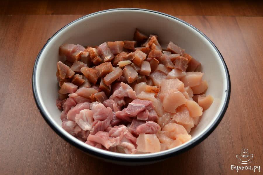 2. Филе курицы нарезаем мелко кубиками 1 х 1 см, мясо с бедер – кусочками 2 х 2 см. Соединяем и перемешиваем.