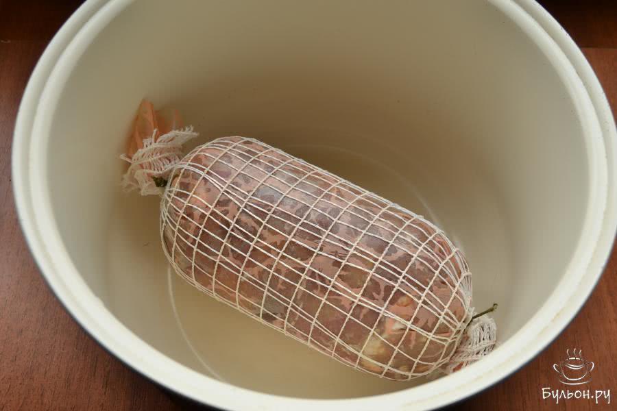 Ставим наполненные ветчинницы в кастрюлю. Наливаем холодную воду, чтобы она покрывала форму с фаршем.