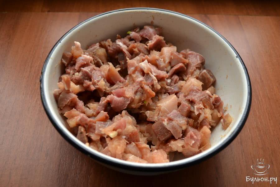 Шаг 4. Оставшееся мясо курицы и свинины прокрутить через мясорубку с мелкими решетками.