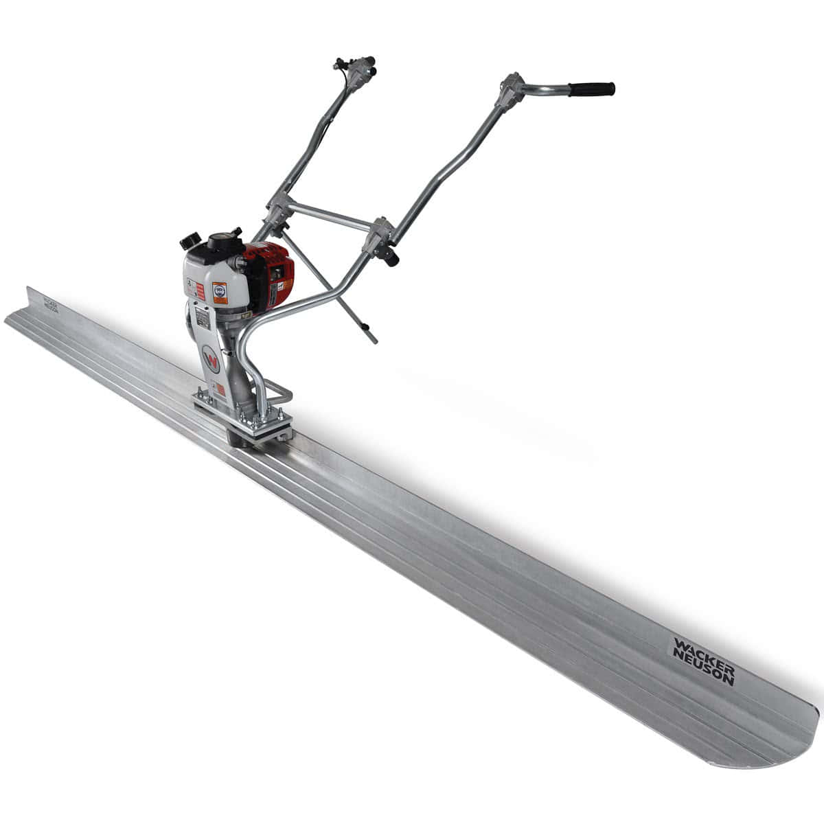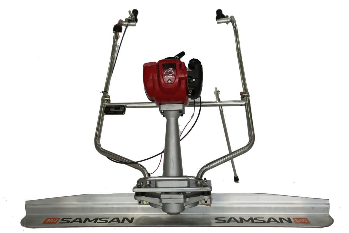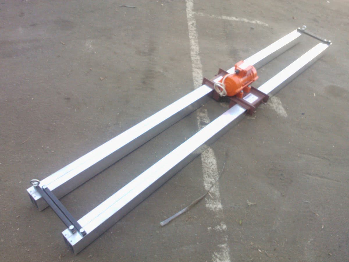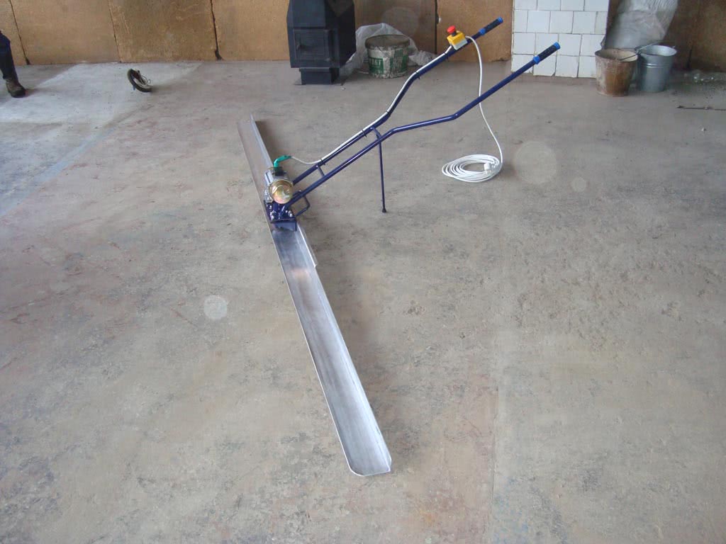 - Плавающую виброрейку – самый простой и доступный для каждого вариант. Конструкция элементарна: алюминиевое правило, ручки и двигатель с мощностью не более 1,2 кВт. Работать может один человек без дополнительной помощи. Площадь работ (длина правила), как правило, составляет не более 3 метров, а толщина бетона – 18 см.