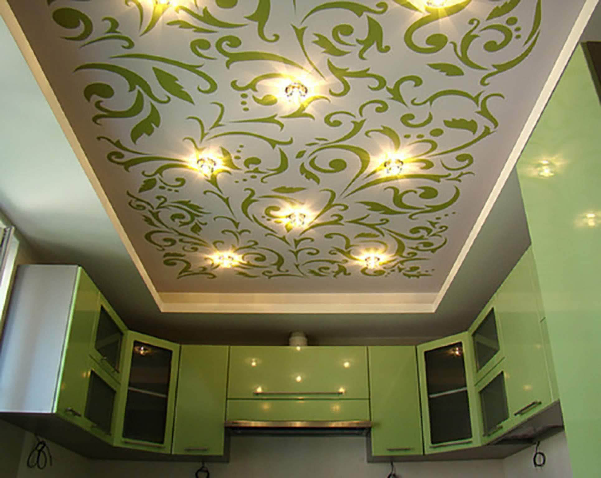 рисунок – точнее говоря, условное или абстрактное изображение, например, букет цветов, чашка кофе, затейливая красочная виньетка. Такой декор удобен тем, что позволяет зонировать комнату, так как собственно изображение занимает не весь потолок, а лишь какую-то его часть