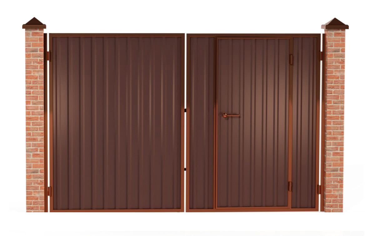 Наконец, калитка может быть как отдельным объектом, так и частью ворот. Так, часто используются распашные ворота с калиткой из профнастила. Такое решение оправдано, если по какой-то причине вы сильно ограничены в размерах входной группы — например, меняете старые ворота и хотите установить новые на те же опорные столбы.
