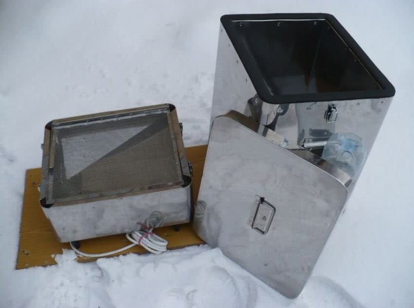Внутри корпуса располагается покрытый оловом железный противень и «корытце». Именно здесь будет размещаться сырье. При этом сам ящик устанавливается на деревянный столб.