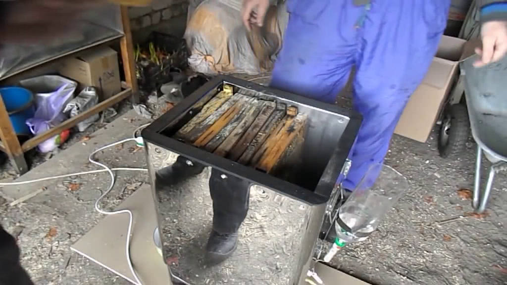 Самодельный агрегат состоит из бака с двойными стенками, изготовленного из нержавеющей стали. Внутренний элемент имеет перфорированную нижнюю часть, верхняя торцевая поверхность позволяет закрепить деревянные рамки с находящимися внутри сотами.