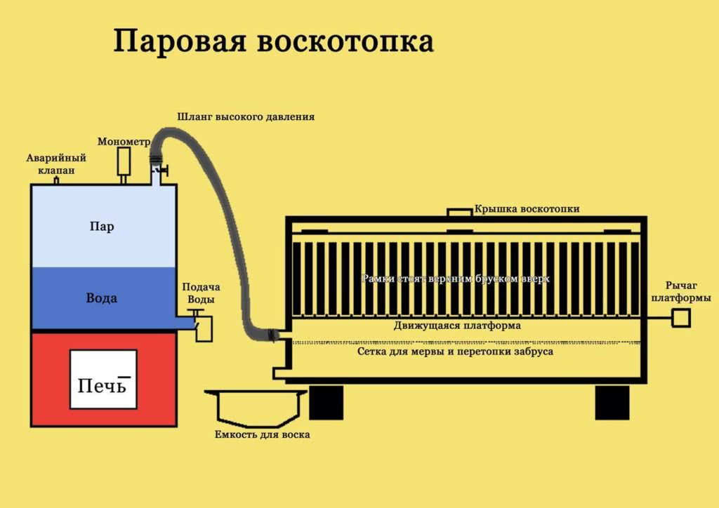 Паровая воскотопка — это устройство обладает простейшей конструкцией. В специальную емкость наливается вода. Она подогревается и «трансформируется» в пар. Который через патрубок попадает в емкость с восковым сырьем. Под воздействием пара воск плавиться и стекает через сетчатое дно в заранее подготовленную емкость. Оставшиеся после этого процесса отходы все еще содержат большое количество воска. Для его извлечения используют специальные прессы. В них используют подогретые в воскотопке отходы старых рамок. Так можно получить максимальное количество воска из выбракованных сот.