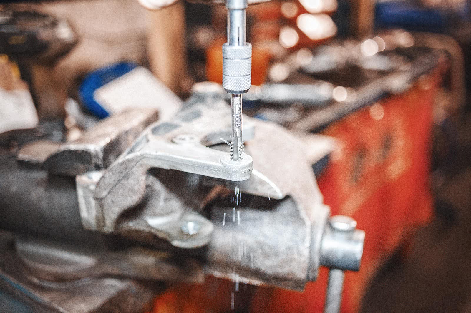 На следующем этапе берём специальный метчик, смазываем моторным маслом/литолом и нарезаем резьбу под вставку. Обработка маслом позволяет получить однородную резьбу без шероховатостей и избавит от алюминиевой стружки в самом канале.