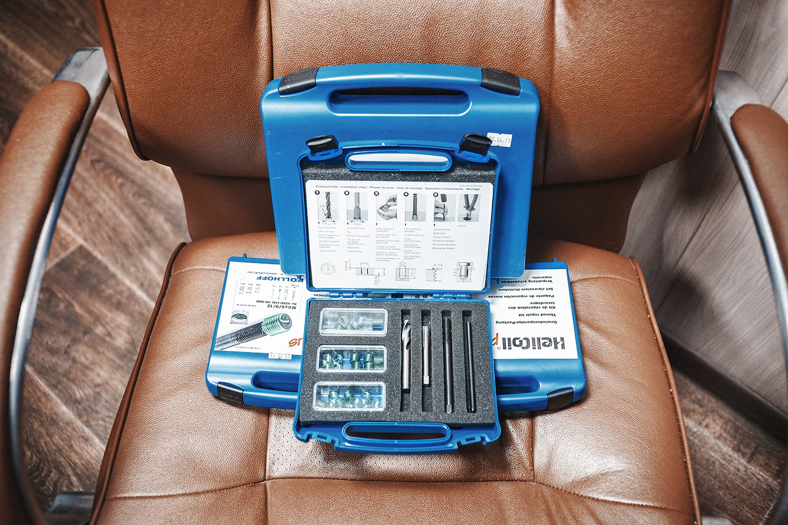 На случай непредвиденных ситуаций у нас в сервисе есть несколько установочных комплектов самых распространённых резьбовых вставок от компании Helicoil, в каждый из которых входят: специальное сверло, специальный метчик, шпиндель, обламыватель и три десятка вставок с разной длинной.