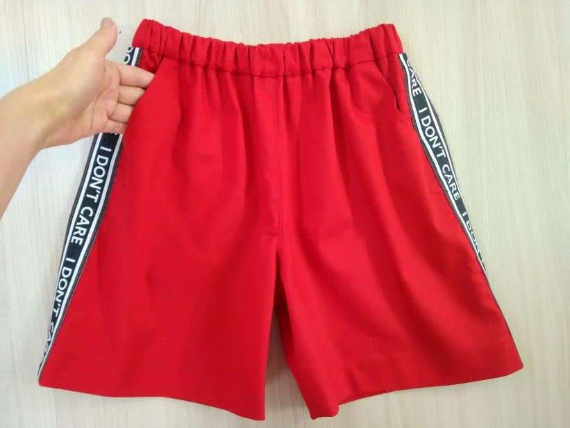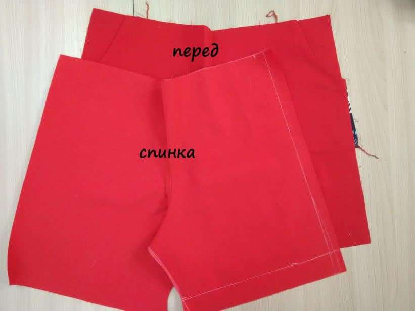Сборка изделия начинается со стачивания переднего и заднего швов. Потом детали соединяются между собой в паху. Далее нужно стачать боковые срезы и померить будущие шорты.