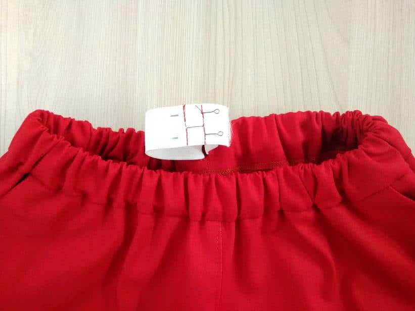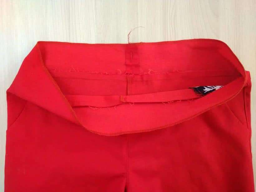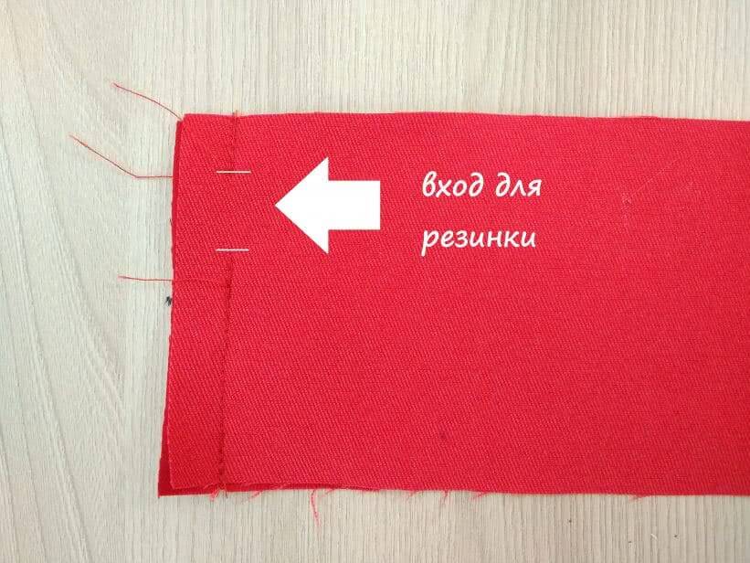 На следующем этапе в пояс вдевается резинка. Ее кончики следует сразу же сшить друг с другом. Выполняются такие манипуляции внахлест.