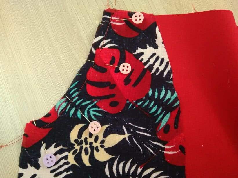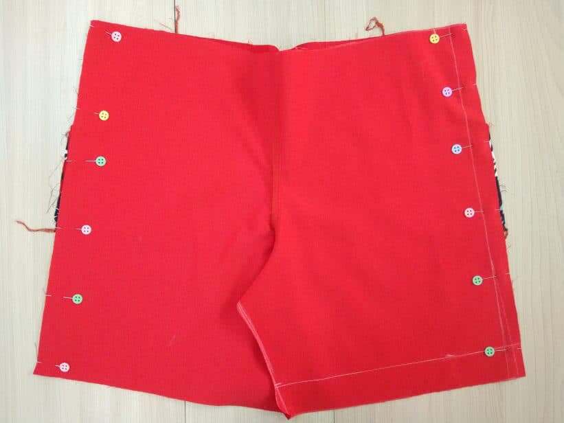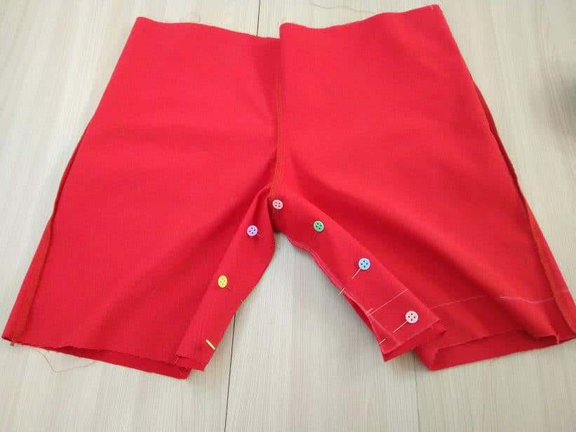 Теперь работа выполняется со вторыми элементами мешковин. Детали нужно наложить одна на другую, направив лицевыми частями вовнутрь. Они скрепляются друг с другом булавками. К самим же шортам они при этом не крепятся.