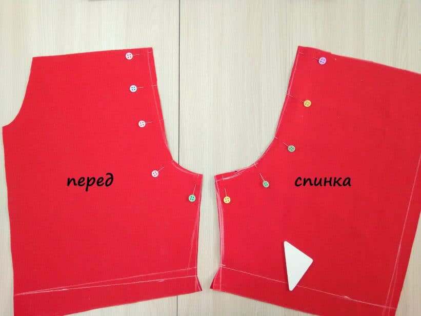 Все элементы соединяются между собой по средним срезам. С этой целью необходимо попеременно накладывать заготовки спинки и полочки одну на другую, располагая их лицевой частью внутрь. Данную конструкцию следует сколоть с помощью швейной машинки и стачать.