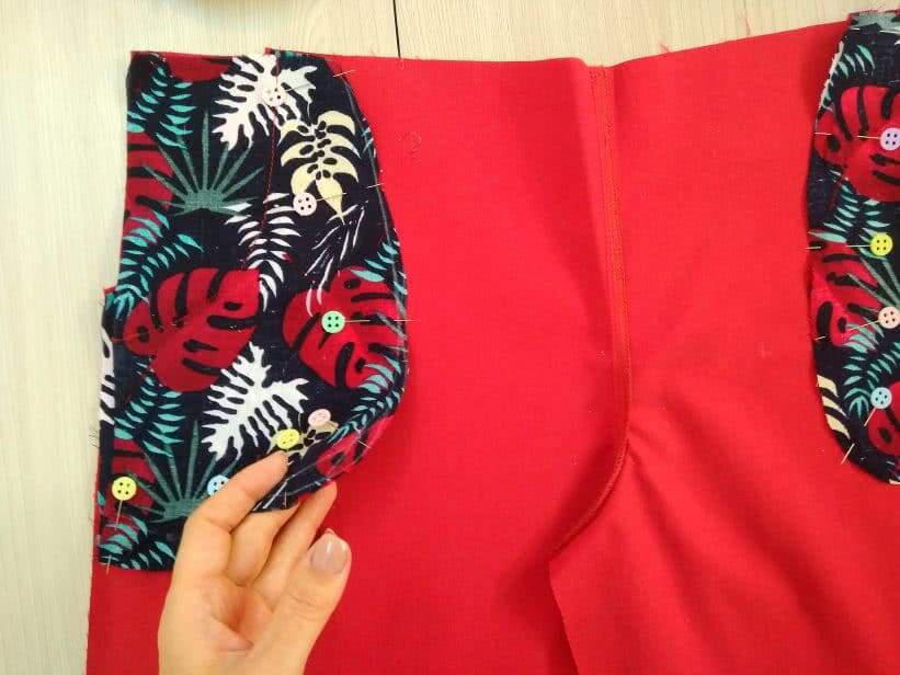 Теперь можно приступить к созданию карманов. В данном случае они представлены с отрезными боками. Эти элементы прикладываются к передней заготовке и фиксируются на ней с помощью булавок.