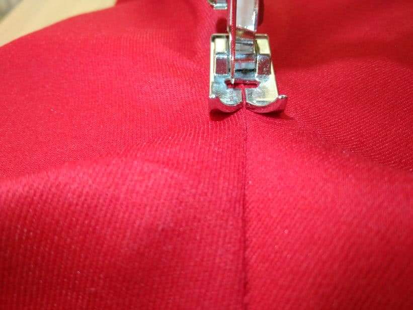 По лицевой части прокладывается строчка. При этом иголка обязательно должна попадать в шов притачивания. Таки образом он прячется во внутренней части и незаметен с лицевой стороны.