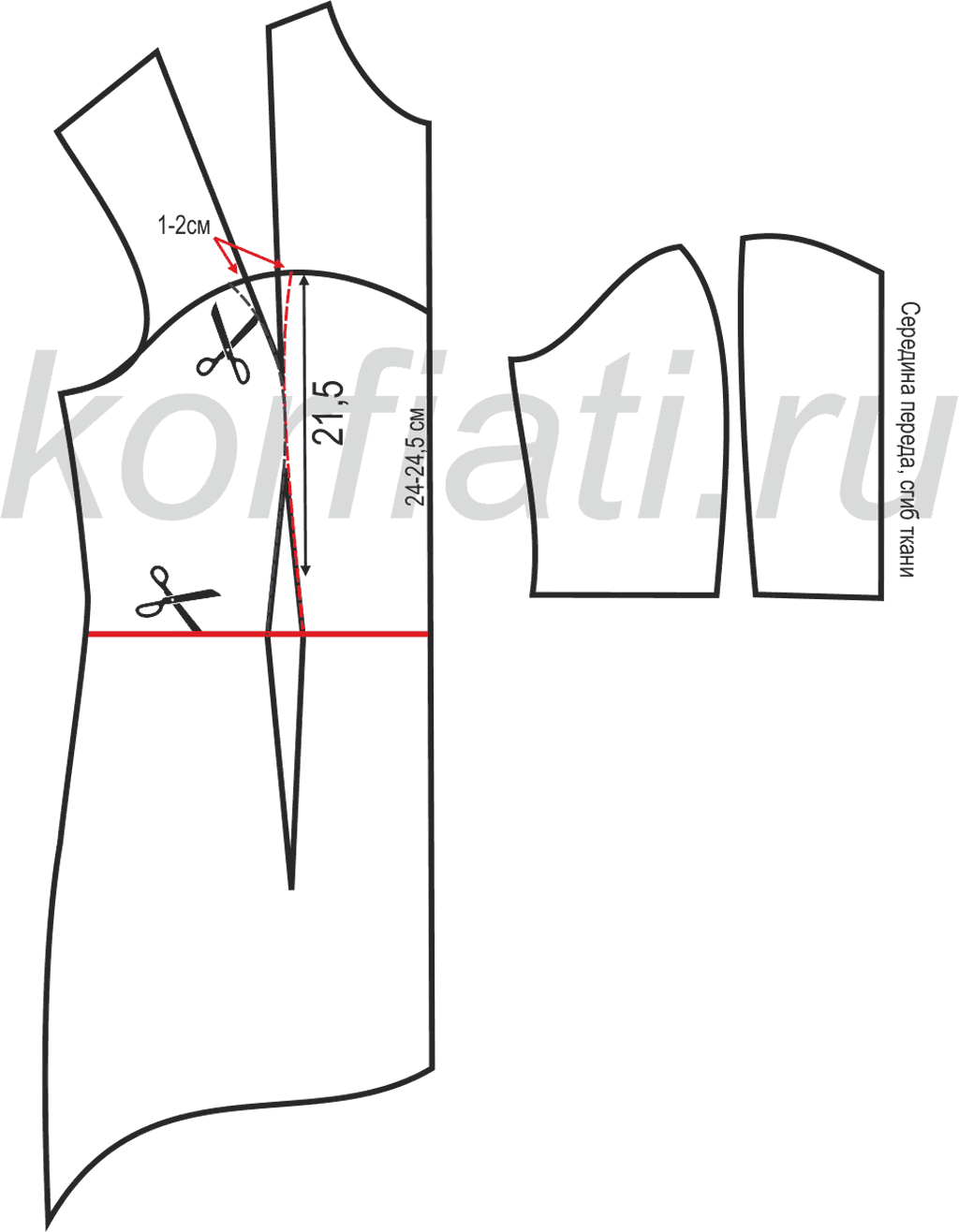 Плечевую линию продлеваем на 4-5 см, прорисовываем новую линию проймы.