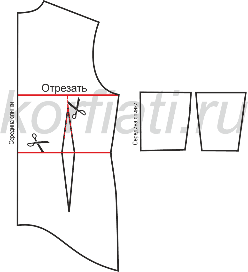 Для раскроя можно воспользоваться готовой выкройкой или выполнить её своими руками. Для этого на основном лекале закрываем нагрудные вытачки на спинке и полочке, вытачки на талии не выполняем. По боковым швам делаем прибавку 1,5-2,0 см на свободное облегание.
