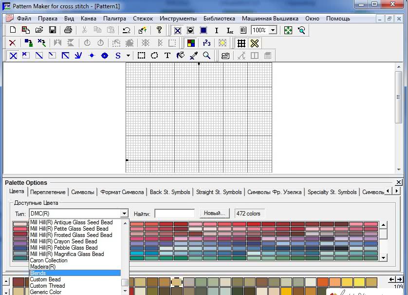 Создание блендов проводится нажатием кнопки Blends в закладке Colors с учетом нити. К примеру, одна может быть DMC, вторая – Ancho. Палитра лента сохраняется нажатием кнопки «ок».