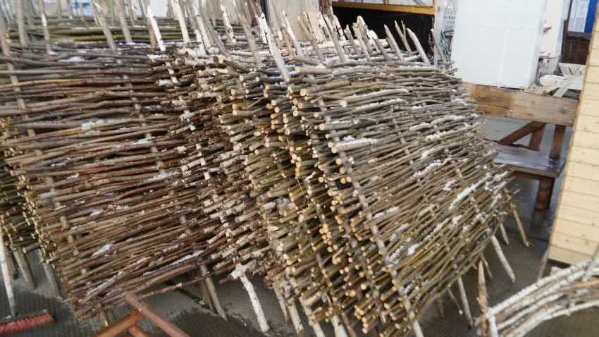 Обратите внимание на фото ниже, на нем секции плетеного забора из очищенной и неочищенной лозы в деревянных рамах. Забор из лозы