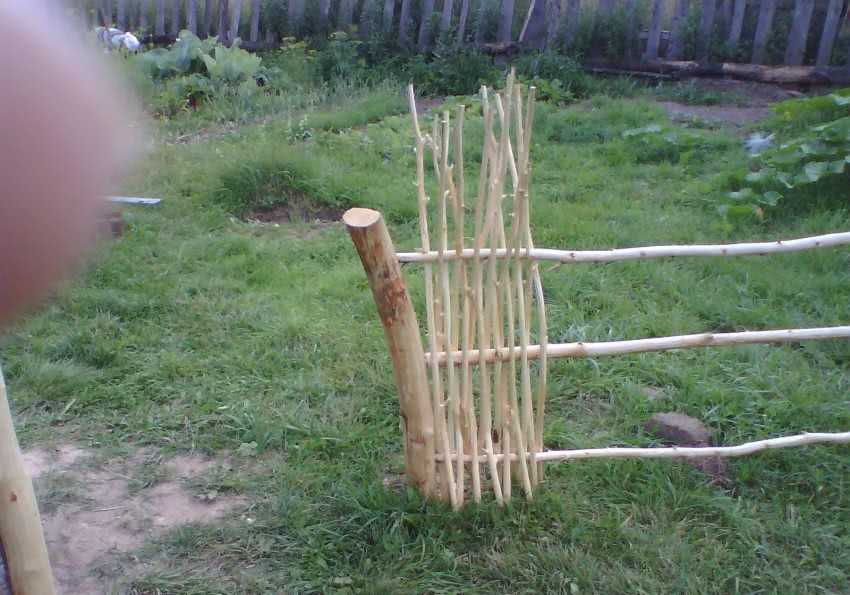 Все очень просто. Прутья лозы перевиваются друг с другом и вкопанными кольями в виде «змейки». Работу нужно начинать снизу. Дерево имеет свойство с течением времени усыхать, поэтому, учитывая это, переплетение нужно делать очень плотным, чтобы не оставалось зазоров.