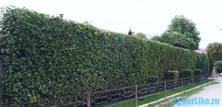 - Живая изгородь — делается с использованием растений, которые обвивают металлическую или деревянную конструкцию.