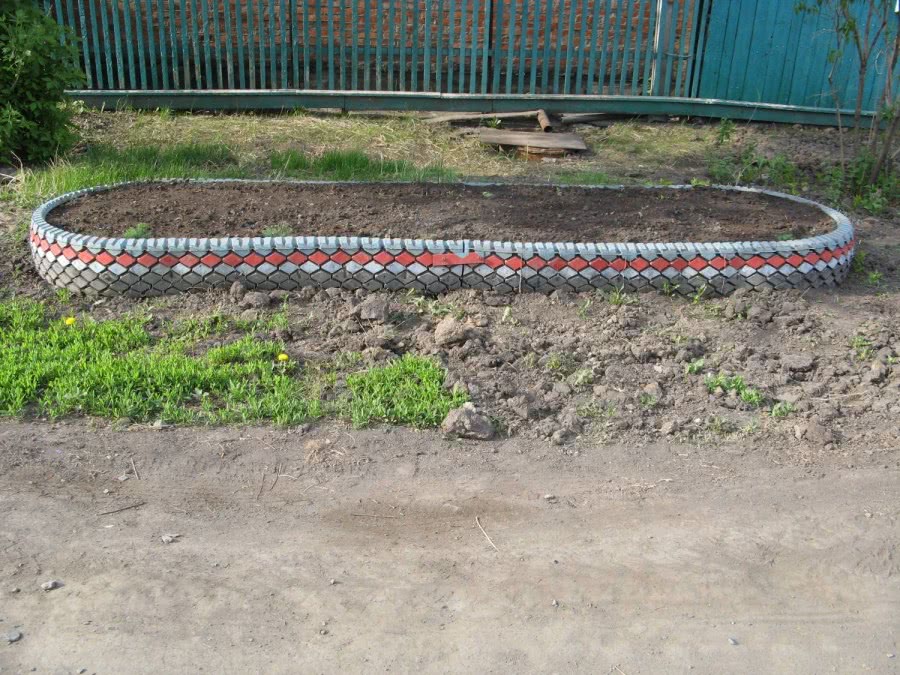 Причем последний материал служит не только оградой, но и местом высадки растений. Выложив шины в несколько ярусов и наполнив внутри землей, удастся получить многоуровневую клумбу. Для придания эстетичности наружную часть покрышек красят.